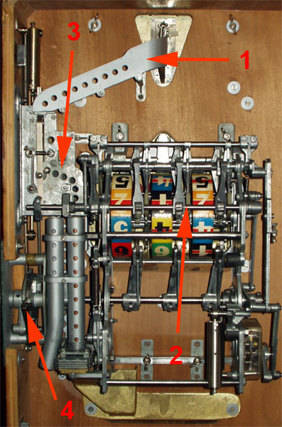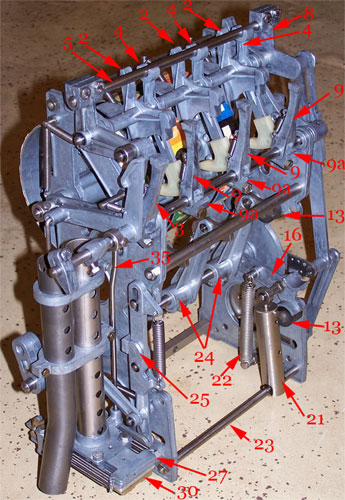 2 - Rasthebel mit Nylon (insgesamt 3 Stück); 3 - Ableitfinger für Gewinnfreigabe; 4 - Gewinntasthebel mit Nylon (insgesamt 3 Stück); 5 - Verbindungsstange für Winkelhebel; 8 - Winkelhebel (rechts) mit Rolle; 9 - Abgleitfinger mit Feder für Rasthebel; 9a - Anschlagstücke für Finger; 13 - Anschlagbolzen mit Gummipuffer (2 Stück); 16 - Anschlaghebel auf Hauptwelle mit Pumpenbolzen; 21 - Luftpumpe für Anschlaghebel; 22 - Abreißfeder; 23 - Pumpenachse; 24 - Abreißhebel (insgesamt 3 Stück) mit Klinke und Feder; 25 - Spannstange für Auszahlung (neu: Knickhebel); 27 - Haltebolzen für Auszahlung (insgesamt 2 Stück); 30 - Unterer oder Anschlagschieber mit Sperrschiene; 35 - Sperrstange für Sperrschiene