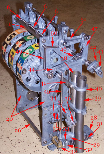 1 - Obere Distanzachse für Chassis; 6 - Zugfedern für Rasthebel (insgesamt 3 Stück); 20 - Seitenwand mit angeschraubten Lagerplatten; 26 - Untere Distanzachse für Chassis; 28 - Schieber für Auszahlung (insgesamt 4 Stück); 29 - Oberteil für Auszahlung; 30 - Unterer oder Anschlagschieber mit Sperrschiene; 31 - Feder für Auszahlschieber (insgesamt 10 Stück); 32 - Unterteil für Auszahlung mit Stellschraube; 33 - Schrauben für Oberteilbefestigung (insgesamt 4 Stück); 34 - Gebogene Schlitzschiene für Spannhebel; 36 - Hauptwelle; 37 - Mitnehmerhebel auf Hauptwelle; 37a - Spannhebel auf Hauptwelle für Auszahlung; 38 - Stapelrohr; 39 - Überlaufrohr; 40 - Doppelschelle; 41 - Haltebolzen für Doppelschelle; 42 - Steuernocke für Sperrstange; 43 - Fingerwelle am Sortierer; 44 - Haltearm für Sperrstange; 45 - Freigabestange für Schieber; 46 - Anschlagbolzen für Kurvenhebel; 47 - Kurvenhebel mit Freigabestange; 49 - Zugfeder für Haltearm Nr. 44; 50 - Zugfedern für Winkelhebel (links und rechts) Nr. 51 U. 8; 51 - Winkelhebel links mit Rolle