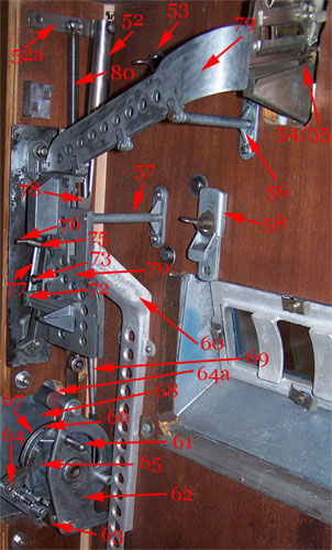 52 - Brems-Luftpumpe für Anreißhebel und Sortierer-Klinke;52a - Halteplatte für Luftpumpe und Feder; 53 - Flügelschraube für (Typen-)Schild mit Münzprüfer; 54/55 - Münzprüfer mit Rücklaufblech für aussortierte Münzen; 56 - Stützbock für Zuführungskanal; 57 - Stützbock für Sortierer (70); 58 - Klemmschieber mit Flügelschraube und Grundplatte; 60 - Oberlaufkanal zur Geldschale; 61 - Mitnehmerstift für Nr. 37; 62 - Kupplungs-Innenteilplatte; 63 - Sperrklinke für Kupplungsscheibe mit Zahnraste; 64 - Mitnehmerklinke für Kupplungsscheibe mit Feder und Splint; 64a - Abreißrolle für Mitnehmerklinke (Kunststoff); 65 - Kupplungsscheibe ohne Zahnraste; 66 - Sperrscheibe zwischen 65 und 67; 68 - Kupplungs-Außenplatte mit Apparat-Nr.; 69 - Zugstange für Gleitschiene mit Durchreißklinke 78; 70 - Sortierer; 72 - Lagerzapfen mit Schwenkhebel; 73 - Lagerzapfen mit Feder für Sperrstange 77; 75 - Feder für Münzsperre; 76 - Stift am Schwenkhebel zum Auffüllen der Röhre; 77 - Sperrstange; 78 - Durchreihklinke mit Gleitschiene und Zugstange Nr. 69; 79 - Zuführungskanal vom Münzprüfer zum Sortierer; 80 - Kupplungsfeder mit Schiene